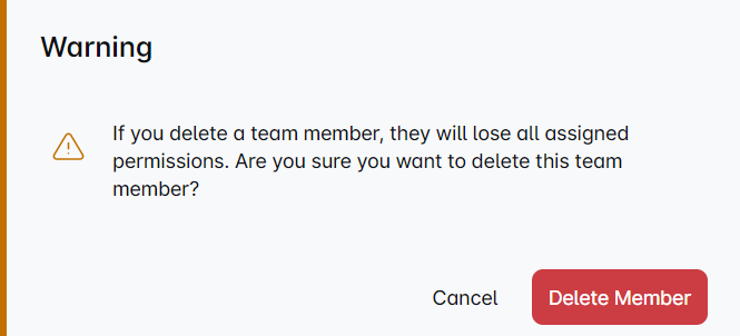 ⚠️ Menghapus anggota tim akan menghapus semua izin yang ditugaskan kepada mereka. Ini adalah perubahan besar, jadi pastikan Anda telah mempertimbangkan semuanya sebelum mengambil tindakan. 📌