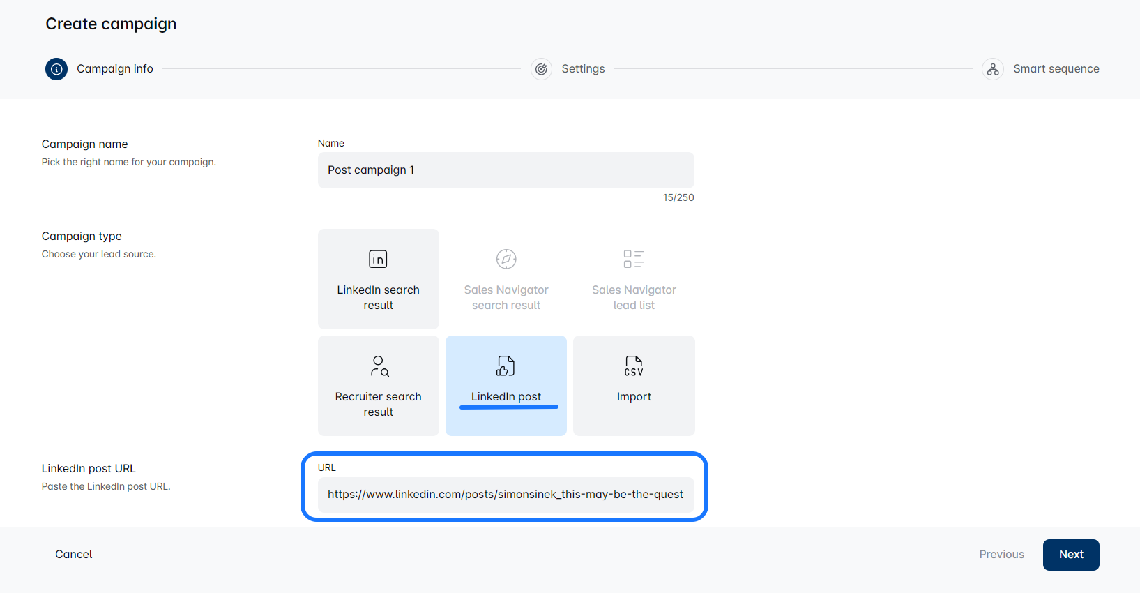 Massimizza la tua portata utilizzando la campagna Post Engagement del Leadriver! Rivolgiti agli utenti di LinkedIn che interagiscono con post pertinenti e connettiti con un pubblico già interessato al tuo settore. Trova semplicemente un post coinvolgente, copia il link e incollalo nel tuo dashboard. Personalizza il tuo approccio per favorire connessioni e aumentare le conversioni. Pronto a elevare la tua strategia di campagna? Immergiti e inizia a connetterti! 🌱🚀