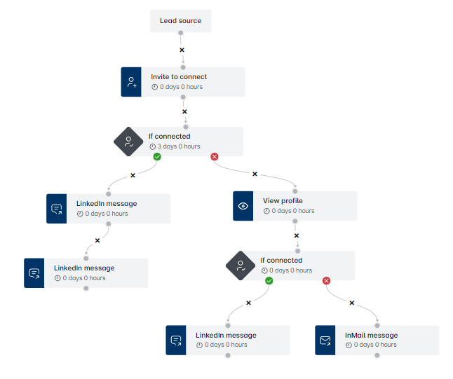 - Questo tipo di campagna ti consente di interagire con i lead più velocemente e in più modi rispetto al semplice invio di un messaggio alle connessioni di 1° grado. Il flusso potrebbe apparire così: