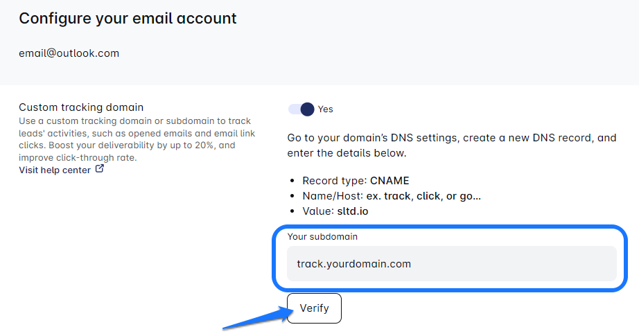 - Inserisci il tuo custom tracking domain nel campo Il Tuo Dominio del Leadriver (ad es., track.tuodominio.com), quindi clicca sul pulsante Verifica per verificarlo.