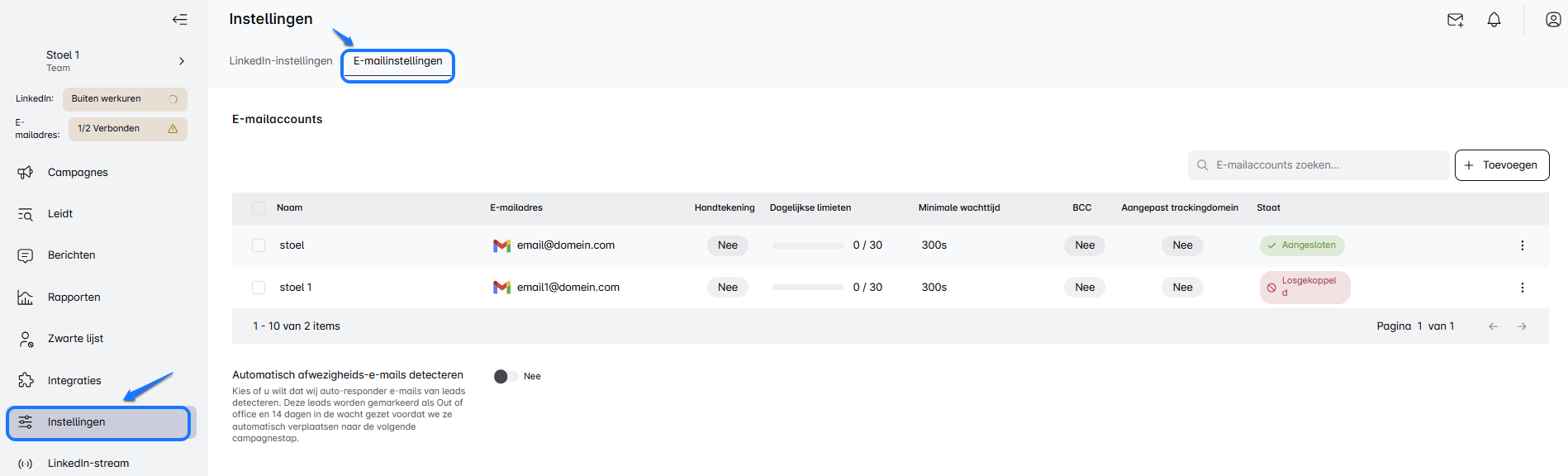 Ga eerst naar het tabblad Instellingen en zoek de sectie E-mailinstellingen. Selecteer de e-mailaccounts die je in bulk wilt bijwerken. -