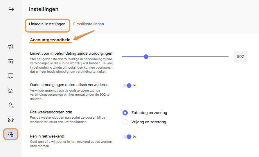 Onderhoud een robuust LinkedIn-profiel met Accountgezondheid instellingen! Beheer openstaande uitnodigingen, verwijder automatisch oude verzoeken en pas weekendactiviteiten aan voor een gebalanceerde aanpak. LinkedIn waardeert authentieke connecties, dus houd het natuurlijk om beperkingen te voorkomen. Houd alles op orde en veel plezier met netwerken! 🤝📚