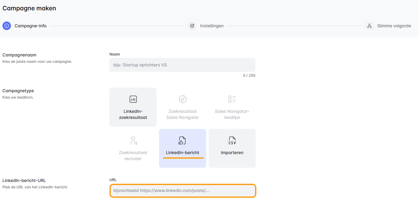Maximaliseer uw bereik met de Post Engagement-campagne van de Leadriver! Richt u op LinkedIn-gebruikers die interactie hebben met relevante berichten en verbind met een publiek dat al geïnteresseerd is in uw branche. Zoek eenvoudig een boeiend bericht, kopieer de link en plak deze in uw dashboard. Personaliseer uw benadering om verbindingen te bevorderen en conversies te verhogen. Klaar om uw campagnestrategie naar een hoger niveau te tillen? Duik erin en begin met verbinden! 🌱🚀