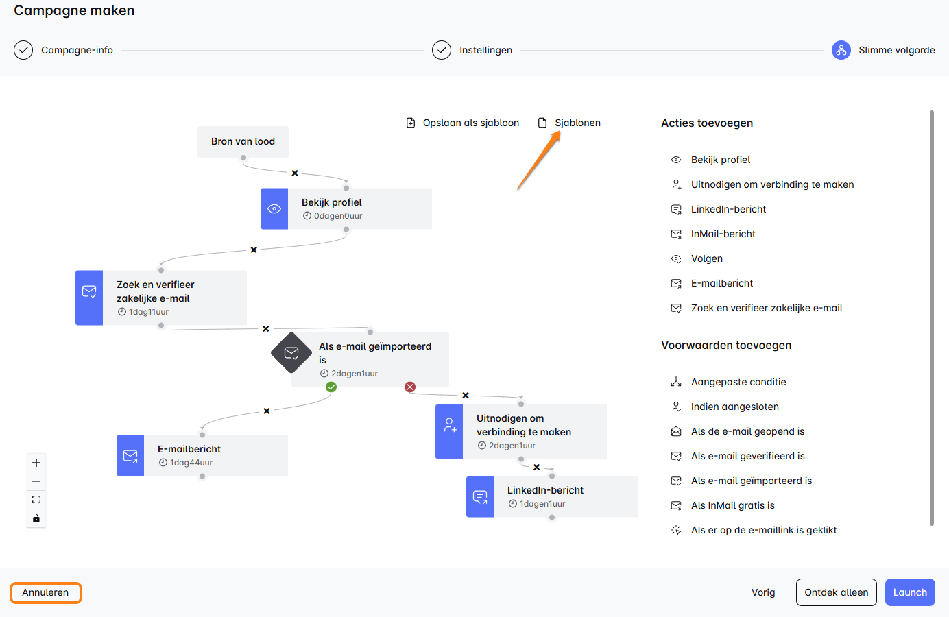 - Zodra je in het Smart Sequence dashboard bent, klik op de Templates knop en selecteer de template die je wilt delen. Het platform slaat dit automatisch op als onderdeel van de campagnetoepassing. Druk nu eenvoudig op de Cancel knop om het scherm te verlaten.