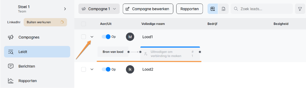 Volg de reis van je leads om de betrokkenheid te monitoren! Klik op Leads, selecteer je campagne en gebruik de pijl naar beneden naast de naam van elke lead om voltooide en aankomende stappen te zien. De volgende stap verschijnt iets transparant, waardoor de voortgang duidelijk blijft. Klaar om inzichten te verkennen? 🎯