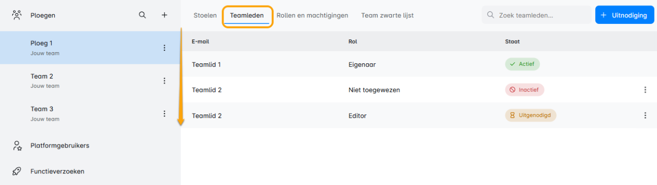Klik op het tabblad 'Teamleden' voor een overzicht van de huidige samenstelling van je team, waar je ieders rollen kunt zien, nieuwe leden kunt uitnodigen en meer.