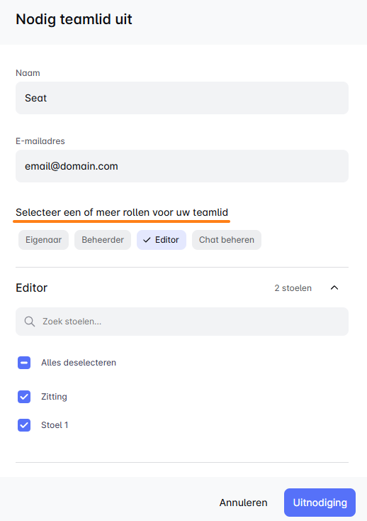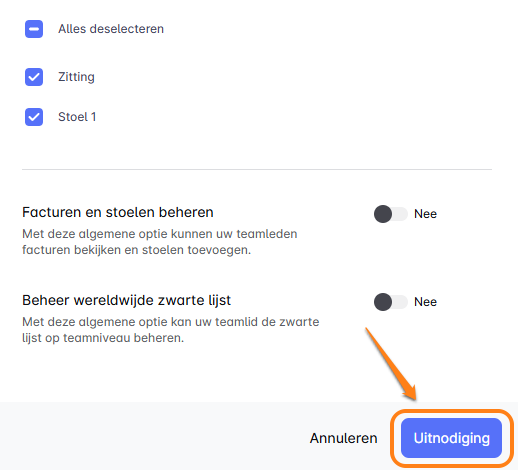 Zodra je alle machtigingen hebt ingesteld, klik je op 'Uitnodigen'. De uitnodiging vliegt naar hun inbox en zodra ze accepteren, zijn ze klaar om in te loggen en aan de slag te gaan met je team! 🚀
