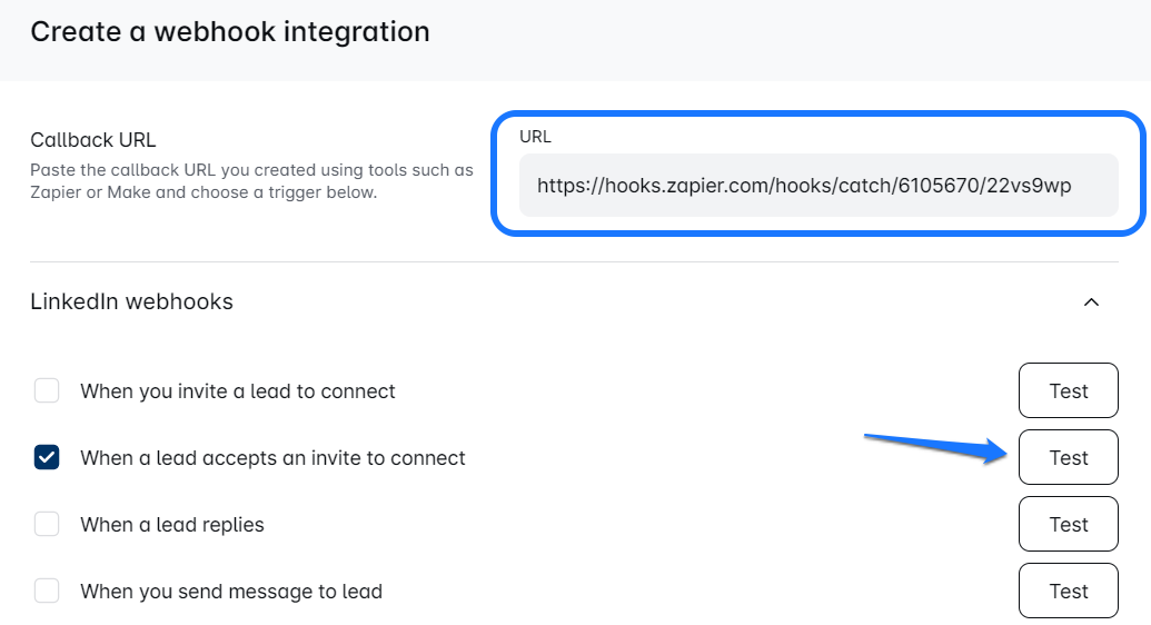 - Ga terug naar de Leadriver en plak de webhook URL in het juiste veld.