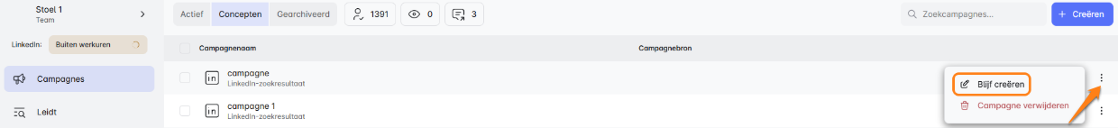 - Klaar om weer aan de slag te gaan? Klik gewoon op de drie puntjes naast je concept en selecteer 'Doorgaan met maken.' Maar wees voorzichtig—per ongeluk op de 'verwijderen' optie klikken betekent permanent afscheid nemen van je campagne, zonder mogelijkheid om deze te herstellen. 🚫
