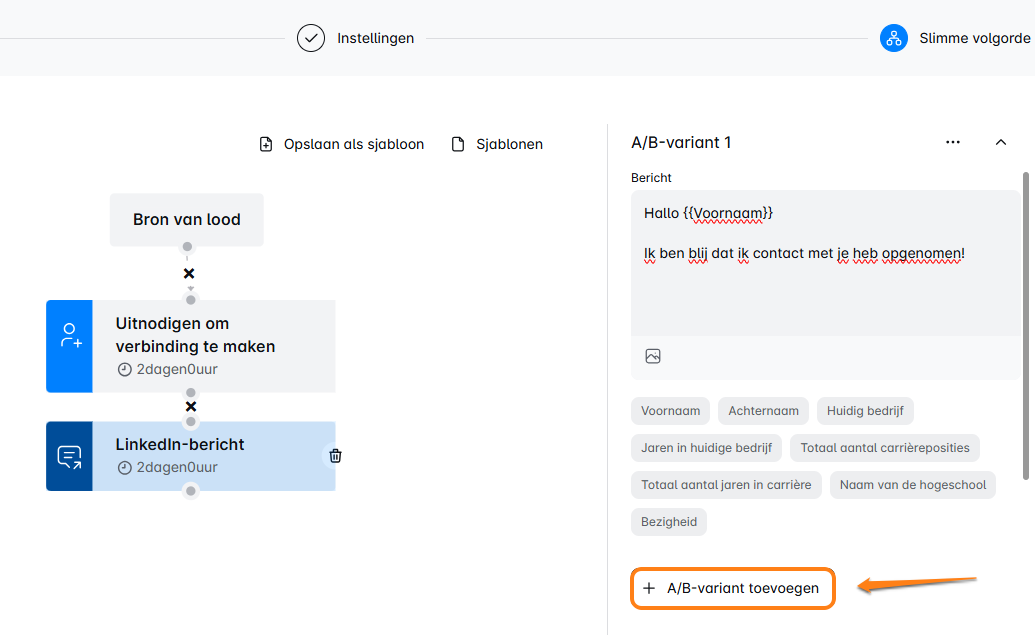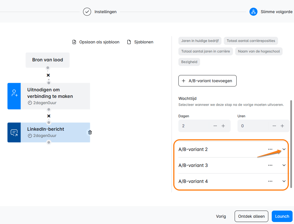 - In de Leadriver kun je verschillende delen van je berichttekst testen, zoals LinkedIn-berichten, e-mails, InMails, uitnodigingen om te verbinden, of zelfs de timing tussen de stappen tijdens het maken van de campagnevolgorde. Je kunt tot 5 verschillende testvarianten maken!