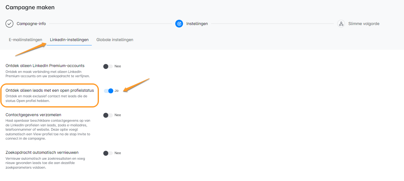🚨 Let op dat als je van plan bent om betaalde InMails te gebruiken, je de optie "Discover Leads with Open Profile status only" moet deactiveren.
