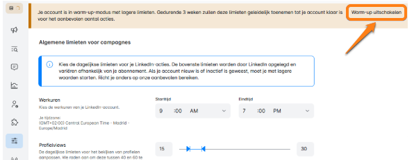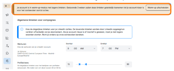 Elk nieuw account in de Leadriver begint in de Opwarmmodus. Deze speciale modus werkt samen met de Globale Limieten voor Campagnes, die je onder het tabblad Instellingen vindt. Het is als een zachte introductie tot de tool, zodat alles vanaf het begin soepel verloopt.