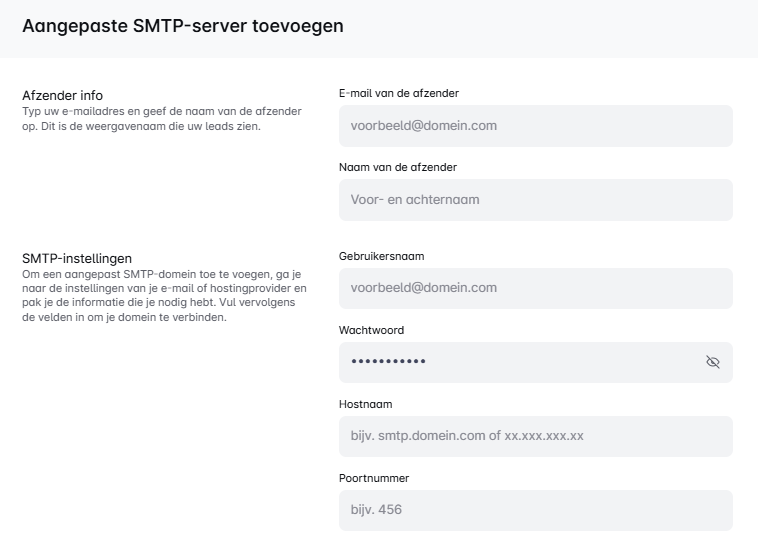 Deze gids behandelt alles wat je moet weten, van het invoeren van SMTP- en IMAP-instellingen tot het selecteren van een beveiligingsoptie, zodat je naadloos e-mails rechtstreeks vanuit de Leadriver kunt verzenden. Met deze stappen ben je in een mum van tijd aan de slag met je aangepaste e-mail. Veel e-mailplezier! 🚀✨