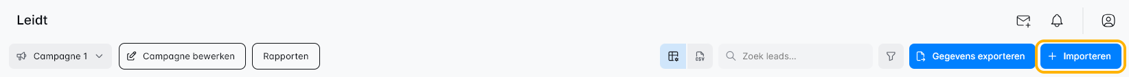 Klik op de naam van de campagne die je wilt uitbreiden. Dit brengt je naar de Leads Lijst-pagina, waar je een glanzende knop vindt met de tekst "Importeren". Klik erop en upload je CSV-bestand gevuld met nieuwe leads, of kies ervoor om een Zoek-URL toe te voegen.