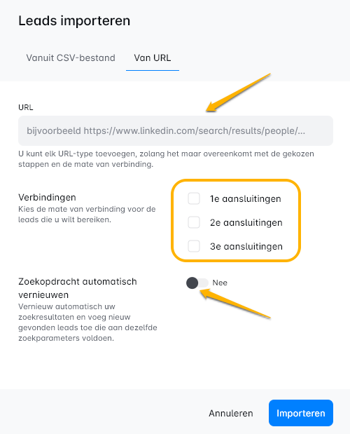 Of voeg een Zoek-URL in: Voer gewoon de URL in, en je bent klaar! 🌟 Je kunt dan je gewenste verbindingsgraad kiezen en beslissen of je automatisch koppelen voor je zoekopdracht wilt inschakelen. 🖇️✨