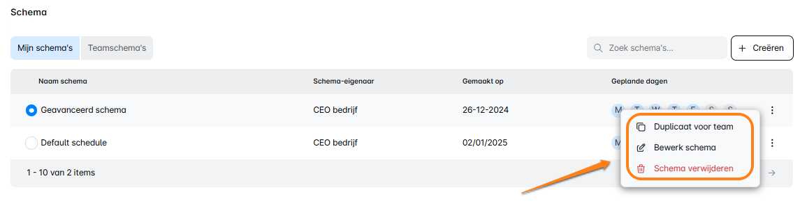 In het menu met drie stippen kun je een schema 'Dupliceren voor team', 'Schema bewerken' of 'Verwijderen' indien nodig.