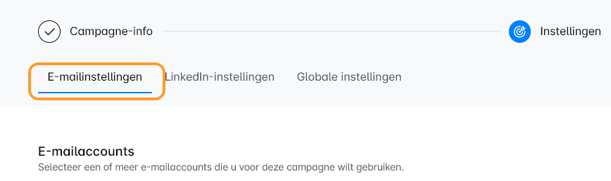 Zodra je de eerste stap van Campagnecreatie hebt doorlopen, kom je op de 'Campagne-instellingen' pagina. Hier bevindt zich het controlepaneel van je campagne. Navigeer en vind het tabblad 'Emailinstellingen' bovenaan.