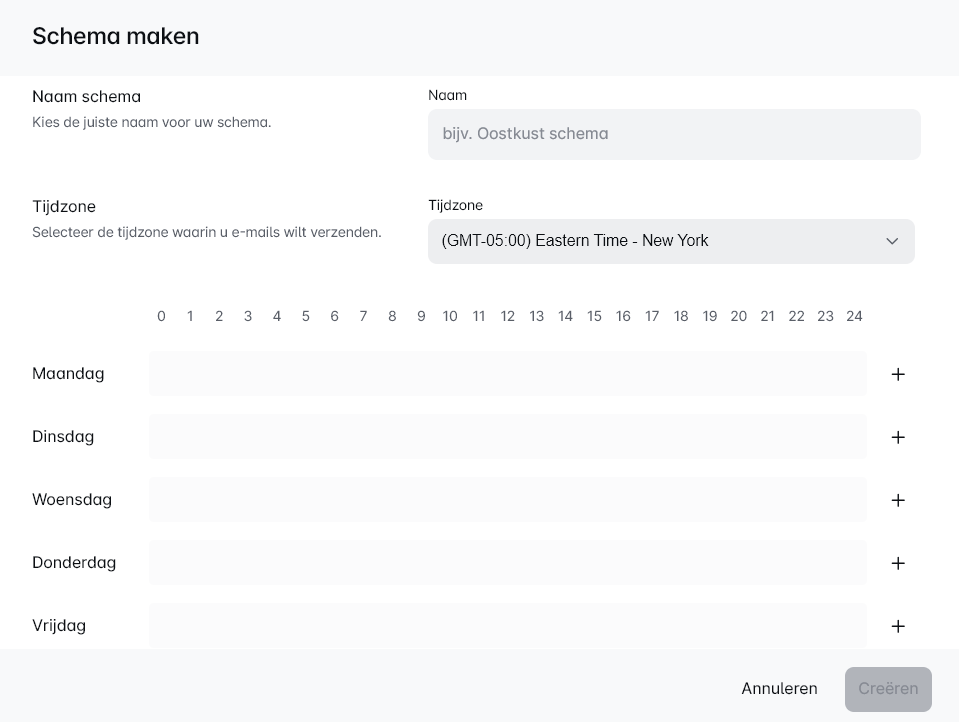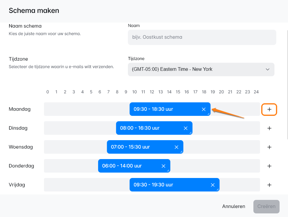 Gebruik het pluspictogram om de uren voor het verzenden van e-mails te definiëren.