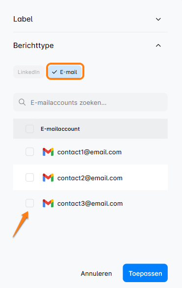 Wanneer je Filteren op e-mailberichten selecteert, kun je een specifiek e-mailadres kiezen om je op te concentreren: